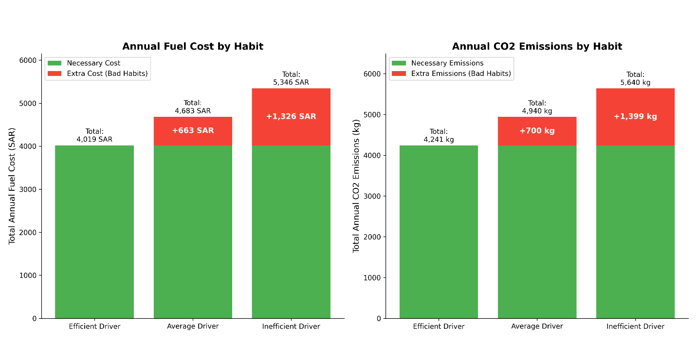 The Inefficient Driver (33% Penalty): This driver consistently drives aggressively, neglects tires, and misuses the A/C. These habits add an extra cost of 1,326 SAR per year.