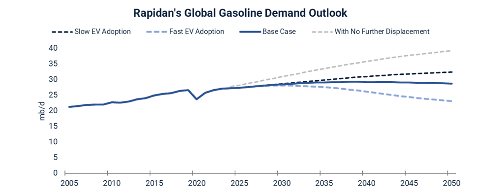 Rapidan’s long-term energy modeling never bought into the policy-driven, imminent-peak-demand view. However, we do consider more realistic – if longer-term – scenarios in which voluntary consumer-led EV adoption significantly displaces gasoline and diesel consumption.
